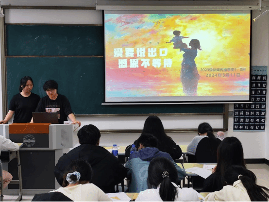 “同學(xué)們,猜一猜明天是什么節(jié)日啊?”“母親節(jié)!”5月11日,新聞傳播學(xué)類專業(yè)2023(7)、(8)班在K202教室開展以“愛要說出口,感恩不等待”為主題的團(tuán)建活動(dòng)。活動(dòng)開始前,活動(dòng)負(fù)責(zé)人、新聞傳播學(xué)類專業(yè)2023(7)、(8)班的班長楊雨霏、朱研溪提前為每位同學(xué)準(zhǔn)備好信紙和信封。朱研溪說:“我們希望通過寫信這種傳統(tǒng)而深情的溝通方式,讓同學(xué)們勇敢表達(dá)自己的心聲,將對(duì)母親的愛訴說于筆尖。”學(xué)生們觀看一段關(guān)于母愛的感人短片后,...